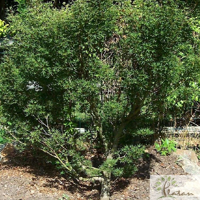 Krzew o powolnym wzroście, wzniesionym, karłowatym pokroju, dorastający do około 3 m wysokości. Posiada ciekawe, ciemnozielone, zwinięte w rurki liście, które jesienią przebarwiają się na żółto i pomarańczowo.