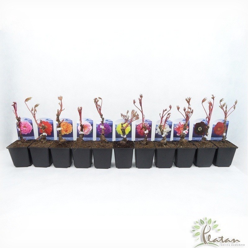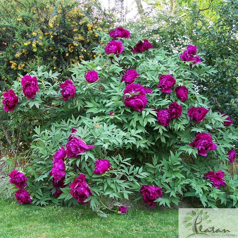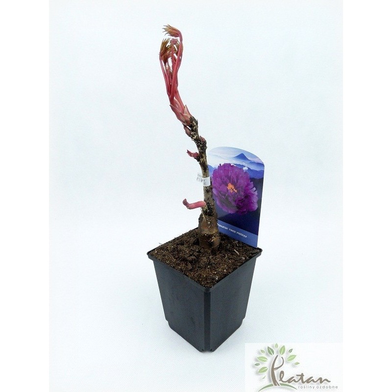 Paeonia suffruticosa, niezwykle dekoracyjny krzew o pięknych, dużych lekko strzępionych kwiatach. Posiada również zdobnicze ciemnozielone, powcinane liście, które w okresie jesiennym przybierają odcienie żółte, purpurowe bądź amarantowe. W ofercie piwonia o dużych, fioletowych kwiatach.